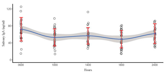 From the GLS model, the effect of time was significant for sIgA (p = 0.0001), but only approached significance for cortisol (p = 0.06). There was an effect of collection day (sIgA; p < 0.0001, cortisol; p = 0.0235) for both biomarkers. Even though no effect of time was found for cortisol in the model, post hoc comparisons using the Tukey’s honestly significant difference (HSD) test indicated that mean sIgA concentration at 06:00 h was higher than that at 10:00 h (p = 0.002) and 18:00 h (p = 0.0001). By contrast, mean cortisol concentration at 06:00 h was only higher than that at 22:00 h (p = 0.0373). All data were used to construct a trend line using loess regression analysis. Mean and standard deviation (SD) are presented in Figure 1 and Figure 2 as well as the trend line for IgA and cortisol concentrations. Quartic (p = 0.04) trend effects for sIgA (Figure 1), and linear (p = 0.002) trend effects for cortisol (Figure 2) were evident throughout the 24 h cycle.
