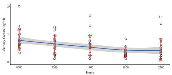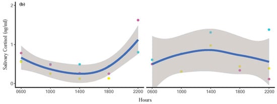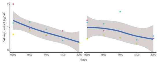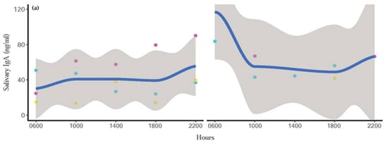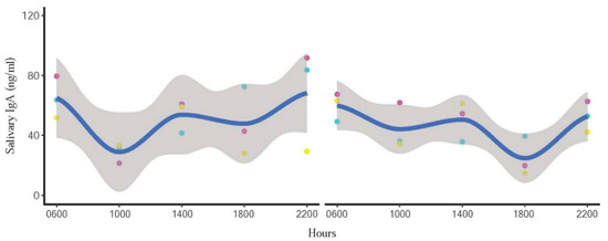 Average sIgA and cortisol concentrations for the three collection periods are summarized in Table 1. The highest average sIgA and cortisol concentrations were observed in samples collected at 06:00 h, while the lowest values occurred between 18:00 and 22:00 h, respectively. Individual concentrations of every time point is provided in Supplementary Materials Table S1.
