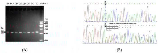 Agarose electrophoresis of MSTN 5 bp indel (A), and sequencing chromas for the 5 bp indel in the MSTN gene (B). Sequencing chromas showed homozygotic deletion type (DD) and heterozygote type (ID).