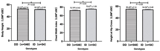 From (Table 2 and Table S2, Figure 2), association analyses showed that the 5 bp indel was significantly associated with the body height, height at hip cross and chest width index (p < 0.05) from 602 kids. Interestingly, the “DD” genotype was superior than “ID” genotype in the body height and the height at hip cross which was reverse to the chest width index.