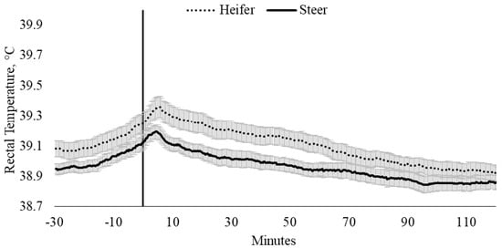 Change in twenty-seconds rectal temperature (±SEM) from baseline rectal temperature (TREC, °C) for heifers (solid black line) and steers (solid gray line), 30 min prior to 2 h post-handling, also showing the time from weighing box (solid black vertical line).