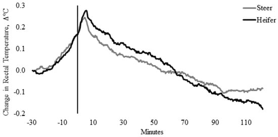 Rectal temperature, irrespective of sex and temperament traits, was influenced by time (p < 0.0001). Pooled TREC data indicated that maximum TREC (39.3 ± 0.04 °C) occurred 4 min after entry into the weighing box (T0; p = 0.008) and remained elevated until 5.7 min. There were no differences in the TREC between heifers (39.4 ± 0.07 °C) and steers (39.2 ± 0.05 °C; Figure 1), nor were there differences in the change in TREC between heifers and steers from baseline TREC (p = 0.596; Figure 2). Change in TREC peaked between 3.3 and 5.0 min and at 5.7 min for steers (0.24 °C) and heifers (0.28 °C), respectively, although the change in TREC of heifers was 0.27 °C between 4.3 and 5.3 min (Figure 2). Post-handling, TREC showed a steady rate of decline (−0.01 °C) between 6.0 and 90.4 min, stabilizing at 38.9 ± 0.03 °C (Figure 1 and Figure 2). After 90.4 min, TREC remained within a temperature range between 38.88 ± 0.03 °C and 38.92 ± 0.04 °C, until data loggers were removed, 120 min post-handling (Figure 1 and Figure 2).