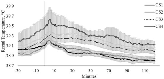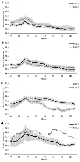 Twenty-seconds mean (±SEM) rectal temperature (TREC, °C) of heifers (gray line) and steers (black line) with crush scores of (a) 1 (CS1; n = 14; ♀ = 4, ♂ = 10); (b) 2 (CS2; n = 16; ♀ = 7, ♂ = 9); (c) 3 (CS3; n = 11; ♀ = 9, ♂ = 2); and (d) 4 (CS4; n = 4; ♀ = 3, ♂ = 1).