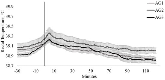 Twenty-seconds mean (±SEM) rectal temperature (TREC, °C) of cattle with agitometer scores ≤ 33 (AG1; n = 16; ♀ = 6, ♂ = 10); 45 ≤ 82 (AG2; n = 15; ♀ = 10, ♂ = 5); and ≥ 86 (AG3; n = 14; ♀ = 6, ♂ = 8).
