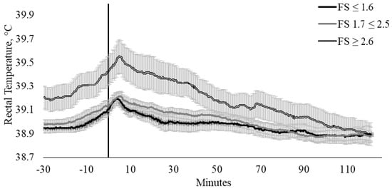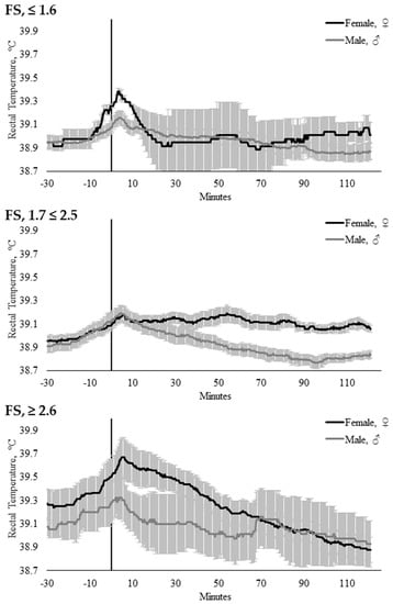 Twenty-seconds mean (±SEM) rectal temperature (TREC, °C) of heifers (gray line) and steers (black line) with flight speeds of FS ≤ 1.6 (n = 13; ♀ = 2, ♂ = 11); FS 1.7 ≤ 2.5 (n = 23; ♀ = 14, ♂ = 9); and FS ≥ 2.6 (n = 9; ♀ = 6, ♂ = 3).