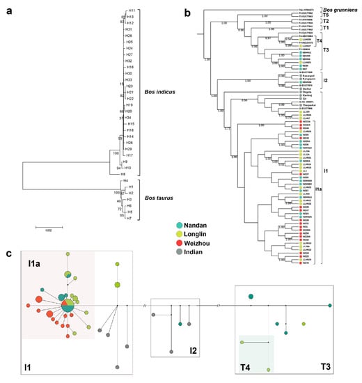 Within I1 lineage, Indian cattle clustered at the root segment, which represents the ancestral indicine mtDNA haplotypes (Figure 2b). The major feature of phylogenetic analyses in Guangxi cattle is the existence of the specific sub-lineage I1a []. The topology of the median-joining network reveals analogous phylogenetic relationship among the four cattle populations. The star-like pattern of this sub-haplogroup is typical for population expansions [], presumably associated with the domestication process itself (Figure 2c).