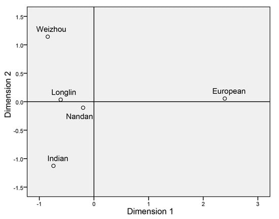 The complete mtDNA genome was analyzed along with seven published mitochondrial genomes from Indian cattle to further study the matrilineal genetic structure of Guangxi cattle breeds. The computational statistical analysis revealed that most of the genetic variance was attributable within breeds (86.69%, p < 0.05). Geographic distribution of breeds (among groups) represented no significant effect and accounted for only 3.64% of the total variability. Estimate of pairwise-population FST values indicated a high genetic differentiation between Indian and Weizhou cattle (0.5231, p = 0.000). Among the Guangxi breeds, Weizhou was the most differentiated from the other two breeds, with FST values ranging from 0.221 (Nandan, p = 0.081) to 0.081 (Longlin, p = 0.081). In contrast, there was limited genetic differentiation between Nandan and Longlin (0.005, p = 0.324). In other words, Nandan and Longlin breeds shared a similar genetic background. MDS analysis was also performed to better visualize the breed genetic relationships using European taurine cattle (AY676855–AY676873) as an outgroup (Figure 3). As expected, the European taurine cattle appears fairly separated from all the indicine breeds, evidencing the sharp dichotomy between the mitochondrial pools of Bos taurus and Bos indicus. As shown in MDS, Longlin and Nandan cattle seemed to be influenced by both Chinese indicine and Indian indicine.