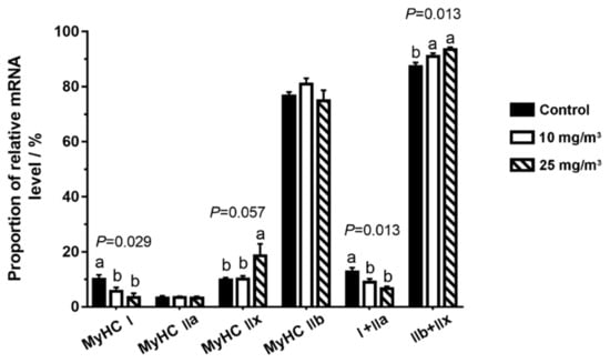 In the pigs exposed to 10 mg/m3 ammonia, the proportion of MyHC I (p = 0.029) was reduced. In the pigs exposed to 25 mg/m3 ammonia, the proportion of MyHC I was also decreased (p = 0.029) but MyHC IIx fiber (p = 0.057) was increased. Interestingly, oxidative fibers (MyHC I and IIa, p = 0.013) were considerably decreased while its glycolytic isoforms (MyHC IIb and IIx, p = 0.013) were increased in pigs exposed to 10 and 25 mg/m3 ammonia.