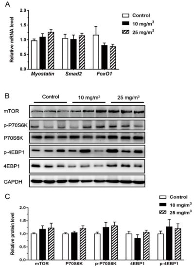 Previous studies have demonstrated that hyperammonemia due to malfunctions of the liver, up-regulates MSTN expression in the skeletal muscle [,]. As a protein synthesis inhibitor, MSTN can inhibit the activation of mTOR or downstream molecules either via AKT dependent or independent mechanism, leading to the loss of skeletal muscle mass and the increase of autophagy [,]. MSTN can also regulate the expression of FoxO1 and Atrogin-1 via acting on the downstream molecules of TGF-β/Smad3 signal pathway [], causing the transition from fast to slow myofibers [,,]. In contrast, aerial ammonia exposure under the level of 25 mg/m3 did not increase serum ammonia as well as muscular MSTN. The expression of molecules on the action pathway of mTOR was not altered either. Therefore, MSTN appears not the key factor for regulating muscle physiology during aerial ammonia exposure.