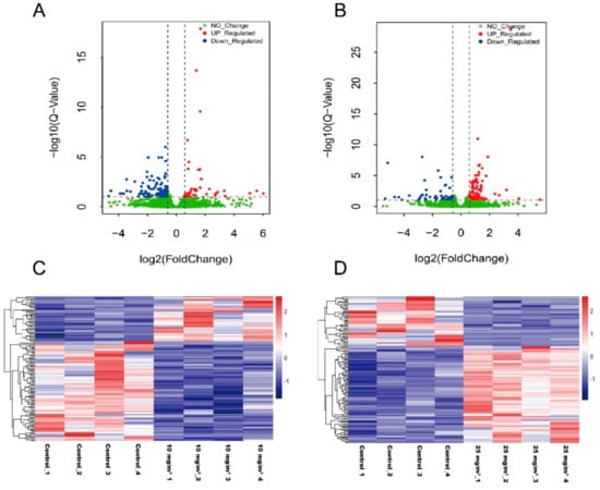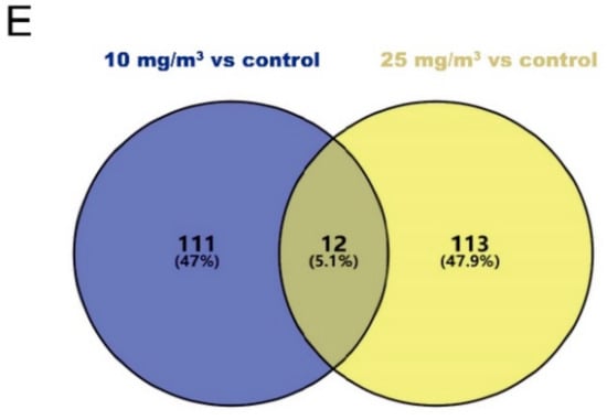 Because no changes in MSTN and its downstream pathways were observed in this study, RNA-Seq was then employed to screen for important genes associated with ammonia exposure. After quality control, each sample obtained 8.65~11.00 Gb clean reads. Over 76% clean reads were mapped to the swine reference genome. Among total mapping reads, the vast majority (79.50–83.90%) fell into annotated exons, 10.70–13.70% was within the large intergenic territory, and only 4.907.80% was located in introns. About 72.02% mapping reads were aligned to a unique gene and about 5.6% reads were mapped to multiple genes. Based upon FPKM of mapped genes, DEGs were analyzed using the DESeq2 method. A total of 123 DEGs (Q-value < 0.1, fold-change ≥1.5 or ≤0.67) have been found in the Longissimus dorsi muscle of pigs exposed to 10 mg/m3 ammonia, which included 85 down-regulated and 38 up-regulated genes (Figure 3A,C). In pigs exposed to 25 mg/m3 ammonia, 125 DEGs were found (Q-value < 0.1, fold-change ≥1.5 or ≤0.67), 42 down-upregulated genes and 83 up-regulated genes (Figure 3B,D). As shown in the Venn Diagram, DEGs in the pigs exposed to 10 mg/m3 ammonia had 5.1% overlaps with those identified in the pigs exposed to 25 mg/m3 ammonia comparing with control pigs (Figure 3E).