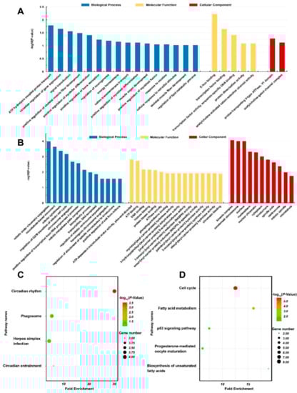 Gene ontology (GO) annotation and KEGG pathway analysis (n = 4 per group). GO annotation of differentially expressed genes in 10 mg/m3 group (A) or 25 mg/m3 group (B) compared with control group; KEGG Pathway analysis of differentially expressed genes in 10 mg/m3 group (C) or 25 mg/m3 group (D) compared with control group.