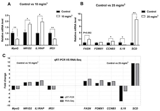 qRT-PCR validation of differentially expressed genes from Longissimus dorsi of pigs (n = 4 per group). Differentially expressed genes in control group vs 10 mg/m3 group (A) and control group vs 25 mg/m3 group (B); fold change of differential expressed genes between qRT-PCR validation and RNA-Seq analysis (C). * Indicates p < 0.05 and ** indicates p < 0.01, GAPDH was used to an internal control.
