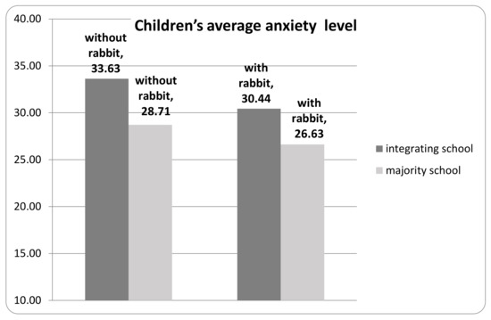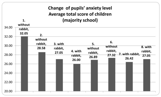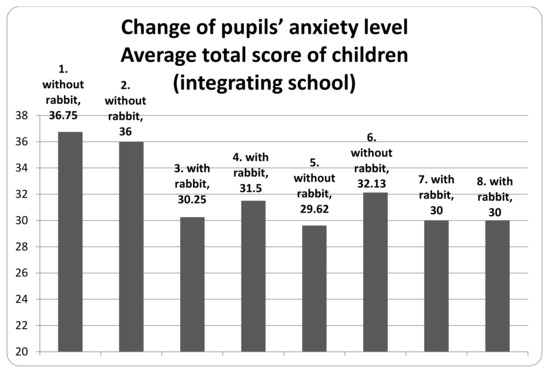 The visual contact between the children and the rabbits was continuous, and in addition, once a week a special course was organized for the pupils: The level of anxiety in children was assessed every three weeks both in the assisted and non-assisted periods, using the State–Trait Anxiety Inventory for Children, STAI-C [55], a widely used report form identifying problem behavior in children. Standard scores were elaborated based on the data of Hungarian children [56]. Thus, the obtained scores are not utilized for diagnosing diseases but to establish the difference compared to the mean. Answering the 20 questions related to anxiety with the responses “never”, “sometimes”, and “frequently” correspond to scores of 1, 2, and 3, respectively. The possible maximum score of the test is 60. Pupils with scores over 35 are classified “anxious/stressed children”, between 30 and 35 scores “slightly stressed children”; below 30 “of normal anxiety/stress level”. Only the results of children (altogether 27) participating in all tests were considered.