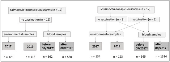 Salmonella is one of the most important bacterial zoonotic and coincident food-borne pathogens worldwide and therefore one of the main causes of food-borne diseases in humans, especially caused by the serovars Salmonella enteritidis and Salmonella typhimurium [1,2]. At European the level, no significant increase or decrease in the number of human salmonellosis cases has been observed over the last years (2013–2017) [2]. In 2017, the declining trend of human cases of salmonellosis in Germany (14,269 cases) did not continue for the first time in recent years [3]. However, the slightly lower number of cases in 2018 (13,529 cases) still remained above the reported number of infections in 2016 [1]. Nevertheless, these published figures presumably do not reflect the actual number of cases, as it must be assumed that a large number of diagnosed cases of salmonellosis are not further investigated and documented with regard to their origin and, despite the high probability of a food-associated infection occurring, these do not appear as such in the case numbers [3]. Given that most Salmonella infections in pigs are subclinical and prevalent among all age groups and in different production stages, identifying infected pigs on farms can be difficult and costly [4]. Due to the demonstrated high correlations between Salmonella prevalence on pig farms and carcass contamination, control mechanisms at the farm level are of major importance [5,6]. At the level of fattening farms, a legally prescribed monitoring programme [7], which has its private counterpart in quality assurance monitoring (“QS-Salmonellenmonitoring”), provides comprehensive data on the situation of farms at the end of the “pre harvest section”. However, as some studies have already identified the acquisition of asymptomatic carriers as the main source of Salmonella in herds [8,9,10], and no related monitoring programmes have involved the piglet producers so far, there is a need to investigate appropriate approaches to reducing cases of Salmonella already in piglet rearing at the beginning of the chain [11,12]. Therefore, epidemiological and bacteriological investigations for Salmonella are of great importance in order to identify a general Salmonella status on piglet-producing farms. For control mechanisms, vaccines are described as the primary tool for disease prevention in veterinary animal species, with these being essential for helping maintain animal welfare and productivity [13]. Vaccines can be used to control clinical diseases whereby in modern pig production, vaccination is mainly used to reduce infection pressure by suppressing the shedding of Salmonella [14]. Because a complete prevention of Salmonella colonisation in pigs by vaccination would require freedom from Salmonella in early age accommodation and among dams, vaccination can only be a supportive measure [14]. In the present study, Salmonella prevalence on piglet-producing farms was investigated using blood samples and environmental samples with regard to distribution on the farm, compliance with previous classification into Salmonella-inconspicuous and Salmonella-conspicuous farms, as well as effects of sow immunisation on Salmonella prevalence in environmental samples and on optical density (OD%) values of the piglets.