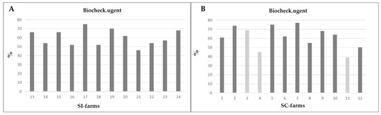 The evaluation of the biosecurity screening showed significant differences (p < 0.05) in the internal biosecurity parameters—although SI farms had an average internal biosecurity of 59.17 ± 16.80%, SC farms had an average of 70.92 ± 6.91%. There were no significant differences in the external and comprehensive biosecurity between SI and SC farms (SI farms: external biosecurity = 56.00 ± 18.73%, comprehensive biosecurity = 60.17 ± 8.89%; SC farms: external biosecurity = 53.25 ± 16.78%, comprehensive biosecurity = 61.58 ± 12.20%; Figure 2).