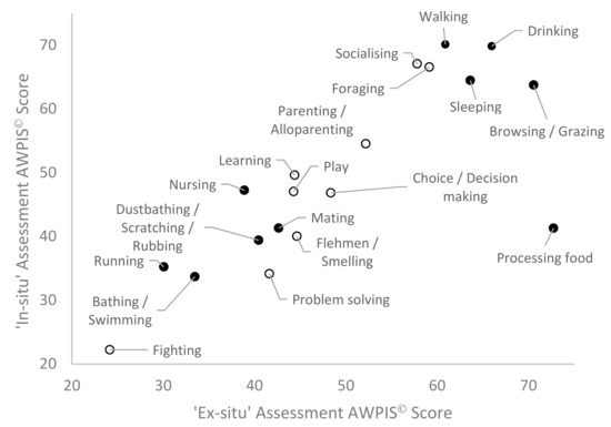 The next greatest discrepancies were for socialising, walking and nursing with the in-situ panel scoring their importance higher than the ex-situ panel, followed by problem solving which was ranked higher by the ex-situ panel. However, directly comparing the AWPIS© scores for each behaviour and cognitive process between the two panels, there was a ±11.5% average deviation between the two panels. The removal of largest outlier (processing food) improved the strength of the already significant correlation markedly (n = 18, r = 0.935, p ≤ 0.001). Regardless of this particular discrepancy between the two panels, the strong correlation between the two assessments justifies their consolidation into a single AWPIS© score for each behaviour and cognitive process.
