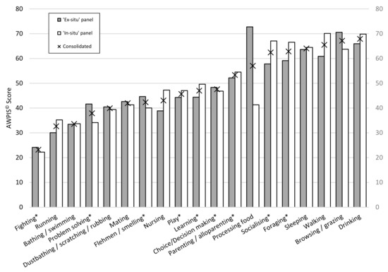 AWPIS© scores for each behaviour and cognitive process for ‘ex-situ’ assessments (grey bars) and ‘in-situ’ assessments (open bars), together with data consolidated from both ‘in-situ’ and ‘ex-situ’ assessments (marked with an X) by which behaviours and cognitive processes are ultimately ranked. * Denotes cognitive process or behaviours with significant cognitive components to them.