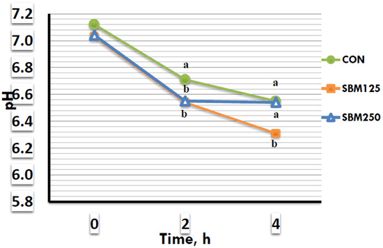 An interaction between the treatment × time (p < 0.0001) was detected for rumen fluid pH among the diets (Figure 1). Rumen pH was similar for lambs fed the different diets at 0 h. Lambs that consumed the SBM125 and SBM250 diets had lower rumen pH after 2 h of feeding than the lambs fed the CON diet. After 4 h of feeding, the lambs that consumed the SBM125 diet showed lower pH than the lambs fed both CON and SBM250 diets.