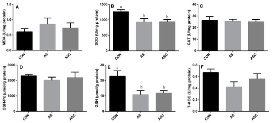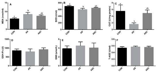 Effects of COS on antioxidant status in serum. Values expressed as mean ± standard error, n = 10. a,b Different superscript letters means significant differences (p < 0.05). CON, basal diet with normal drinking water; AS, basal diet with 0.1% H2O2 in drinking water; ASC, basal diet supplemented with 200 mg/kg COS, and with 0.1% H2O2 in drinking water. MDA, malondialdehyde; SOD, superoxide dismutase; CAT, catalase; GSH-Px, glutathione peroxidase; GSH, glutathione; T-AOC, total antioxidant capacity. (A) the content of MDA; (B) the activity of SOD; (C) the activity of CAT; (D) the activity of GSH-Px; (E) the content of GSH; (F) the content of T-AOC.
