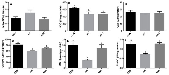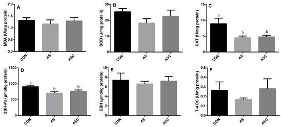 Administration of H2O2 in drinking water increased (p < 0.05) the content of MDA in serum (Figure 2A), and decreased (p < 0.05) the activity of SOD (Figure 2B) and CAT (Figure 2C) in the AS group compared with the CON group. No significant differences were observed on the activity of MDA, SOD, CAT, GSH-Px, GSH, or T-AOC.