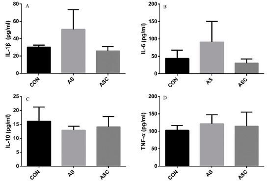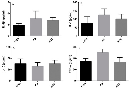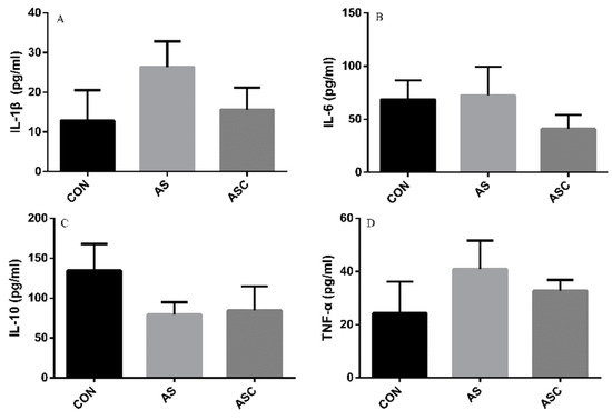 Effects of COS on inflammatory cytokines in serum. Values presented as mean ± standard error, n = 10. CON, basal diet with normal drinking water; AS, basal diet with 0.1% H2O2 in drinking water; ASC, basal diet supplemented with 200 mg/kg COS, and with 0.1% H2O2 in drinking water. IL-1β, interleukin-1β; IL-6, interleukin-6; IL-10, interleukin-10; TNF-α, tumor necrosis factor-α. (A) the concentration of IL-1β; (B) the concentration of IL-6; (C) the concentration of IL-10; (D) the concentration of TNF-α.