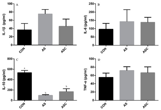 Effects of COS on inflammatory cytokines in the spleen. Values presented as mean ± standard error, n = 10. a,b Different superscript letters mean significant differences (p < 0.05). CON, basal diet with normal drinking water; AS, basal diet with 0.1% H2O2 in drinking water; ASC, basal diet supplemented with 200 mg/kg COS, and with 0.1% H2O2 in drinking water. IL-1β, interleukin-1β; IL-6, interleukin-6; IL-10, interleukin-10; TNF-α, tumor necrosis factor-α. (A) the concentration of IL-1β; (B) the concentration of IL-6; (C) the concentration of IL-10; (D) the concentration of TNF-α.