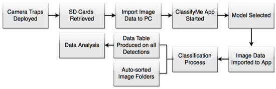 The software is developed so it can be installed on individual computers under an End User Licence Agreement. The intent is that the user will upload an SD card of camera trap images, select the relevant model and then run ClassifyMe on this dataset to automatically identify and sort the images (Figure 1).