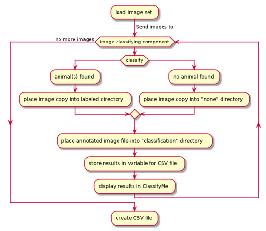 When an image dataset is loaded and the classification process started (Figure 3), each image is scanned sequentially for the presence of an animal (or other category of interest) using the selected model. ClassifyMe automatically sorts the images into sub-directories corresponding to the most likely classification and can also automatically detect and sort images where no animal or target category is found. The results are displayed on-screen via the dialogue box which reports the classification for each image as it is processed. The full set of classification results, which includes the confidence scores for the most likely categories, is stored as a separate csv file. ClassifyMe creates a separate sub-directory for each new session. The full Unified Modelling Language (UML) structure of ClassifyMe (omitting security features) is described in Supplementary Material S1.