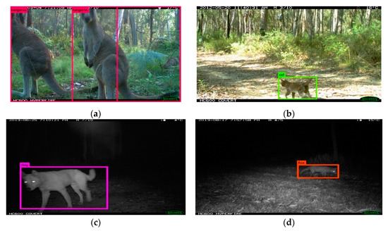 Detection Image examples from the New England dataset. (a) Macropod (Kangaroo), (b) Cat, (c) Dingo (dog) and (d) Fox.