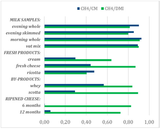 In the case of methane intensity per kg of corrected milk, estimates from samples of dairy products and by-products failed to achieve high correlations with estimates from the reference milk and reached values around 0.50 only in the case of fresh cheese, ricotta, and whey.