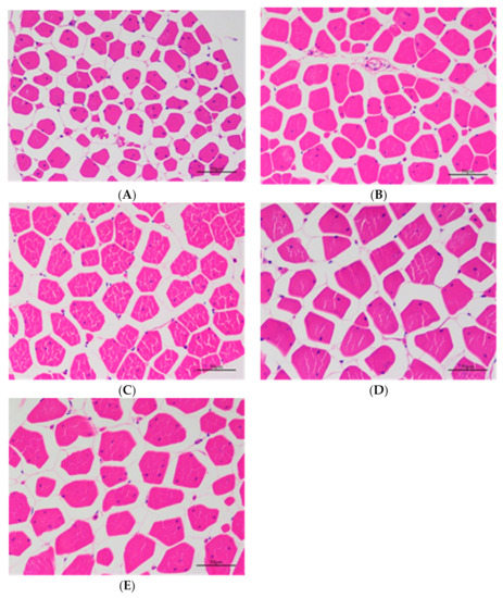 Histological evaluation of muscle fibers in samples with different slaughter age (400×). (A) 60 days. (B) 90 days. (C) 120 days. (D) 150 days. (E) 180 days.