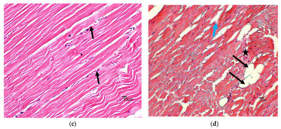 Histological analysis on longissimus thoracis et lumborum muscle of goats supplemented with naturally produced lovastatin (a) A photomicrograph of longitudinal section of muscle from control (0 mg/kg BW) group showing normal morphological architecture of the skeletal muscles, with myofibril and myocyte nuclei located peripherally on the myofibril filaments with myofibril separated by interstitial space and the striated character of normal muscular structure (double-ended arrow) (H&E × 400). (b) A photomicrograph of longitudinal section of muscle (2 mg lovastatin/kg LW) showing mild hemorrhages within the interstitial space (arrow) and striated character of normal muscle structure (double-ended arrow) (H&E × 400). (c) Photomicrograph of muscle (4 mg lovastatin/kg LW) showing mild hemorrhages within the interstitial space with normal morphology myofilament (H&E × 400) (d) Photomicrograph of muscle (6 mg lovastatin/kg LW) showing marked myofibrillar degeneration (star), cellular infiltration associated with myofibril rupture (blue arrow) and vacuolization of myocytes and interstitial space (arrow) (H&E × 400).