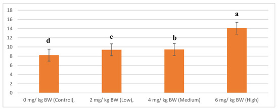 The fiber diameter results indicate that significant differences were present between the treatment groups (p < 0.05). As shown in Figure 2, muscle fiber diameter increases with increase in lovastatin concentration. The Control group recorded the lowest fiber diameter (8.22 mm) while the High treatment group recorded the highest fiber diameter (14.08 mm).