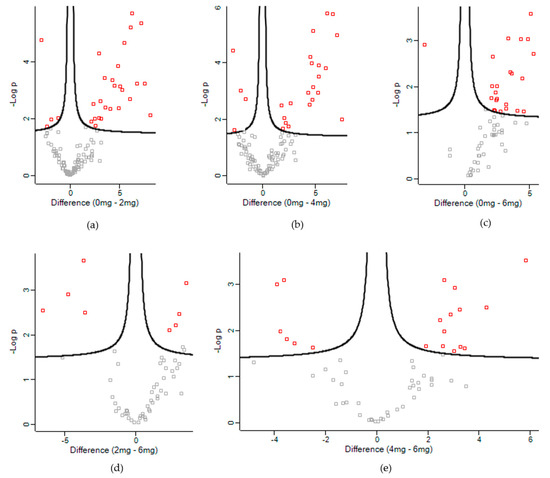 Volcano plots of differentially expressed proteins in: (a) Control vs. Low, (b) Control vs. Medium, (c) Control vs. High, (d) Low vs. High and (e) Medium vs. High.