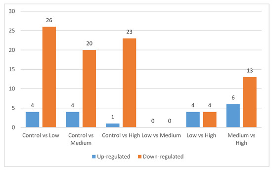 Number of differentially expressed proteins in six comparisons: Control vs. Low, Control vs. Medium, Control vs. High, Low vs. Medium, Low vs. High and Medium vs. High.