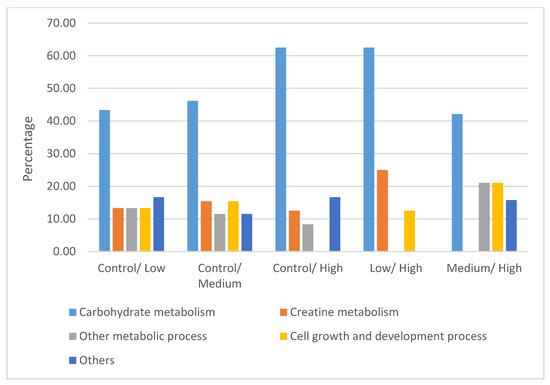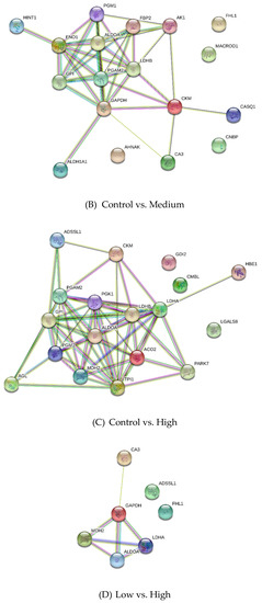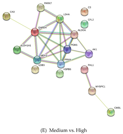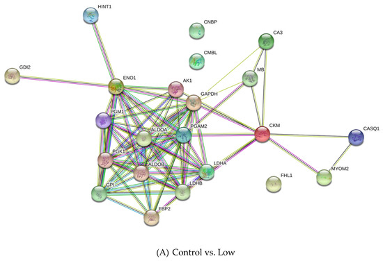 The differentially expressed proteins were classified using the Panther Classification System and DAVID. These proteins were grouped on the basis of their functional role in the following categories: carbohydrate metabolism, creatine metabolism, other metabolic processes, cell growth and development process, and others (Figure 5). The interaction networks of the differentially expressed proteins were generated using String v11.0 and are presented in Figure 6. Generally, these proteins are involved in a network of carbohydrate metabolism, energy production, and skeletal and muscular system development and function.