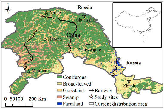 - Dou, H.; Jiang, G.; Stott, P.; Piao, R. Climate change impacts population dynamics and distribution shift of moose (Alces alces) in Heilongjiang Province of China. Ecol. Res. 2013, 28, 625–632. [Google Scholar] [CrossRef]