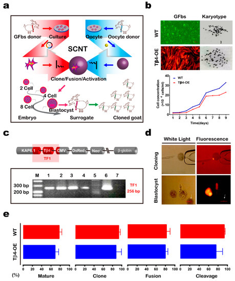 Generation of Tβ4-overexpression (Tβ4-OE) Alpas cashmere goats. (a) Schematic of the procedure used to produce Tβ4-OE goats via somatic cell nuclear transfer (SCNT). (b) Morphology, karyotype, and growth of WT and Tβ4-OE goat fibroblasts (GFbs). (c) Genotype identification of WT and Tβ4-OE GFbs. Lane M, DL500 DNA marker; Lanes 1–4, PCR amplicons of the Tβ4 gene from the four transgenic GFbs; Lane 5, PCR amplicons of the Tβ4 gene from the GFbs; Lane 6, PCR amplicons of the Tβ4 gene from the pCDsR-KT expression vector; Lane 7, PCR amplicons of the Tβ4 gene from the blank control. (d) The Tβ4-OE cloned embryos at various developmental stages. White arrow: blastocyst. Scale bar: 100 μm. (e) Comparison between Tβ4-OE (red) and wild type (WT) (blue) cloned embryos at various developmental stages.