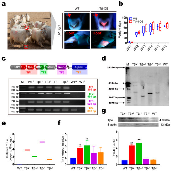 Identification of Tβ4 overexpression (Tβ4-OE) Alpas Cashmere goats. (a) Tβ4-OE cashmere goat, showing characteristic red lips and hooves. (b) Body weight of wild type (WT, n = 8) and Tβ4-OE (n = 23) goats from at birth to six years old. Blue boxes are controls; red boxes are Tβ4-OE goats produced via SCNT. (c) PCR analysis showing Tβ4 gene insertion. WTP, positive control; WTN, negative control; WTB, blank control. (d) Southern blot and (e) absolute quantitative PCR showing Tβ4 copies numbers. (f) qPCR and (g) western blot showing Tβ4 expression in WT and Tβ4-OE hair follicles to assess the expression of Tβ4. Asterisks indicate that mean expression was significantly different from the control (* p < 0.05; ** p < 0.01). Bars indicate the means of the three replicates; error bars indicate the standard errors of the means.
