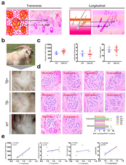 Data showing that the overexpression of Tβ4 increased secondary hair follicle (SHF) number and cashmere yield. (a) H&E staining of hair follicle in transverse and longitudinal section. Arrows indicate the primary hair follicle (PHF) and the SHF. (b) Comparison of cashmere growth in different goats. (c) Cashmere clean weight, cashmere thickness, and fiber length in 15 Tβ4 overexpression (Tβ4-OE) and five wild type (WT) goats at two years old (* p < 0.05). (d) H&E staining of backside and scapularis skin from Tβ4-OE and WT goats. Scale bar: 100 μm (** p < 0.01). (e) The correlation between Tβ4 expression and cashmere clean weight, cashmere thickness, fiber length, and the cashmere to hair ratio (SHF/PHF).