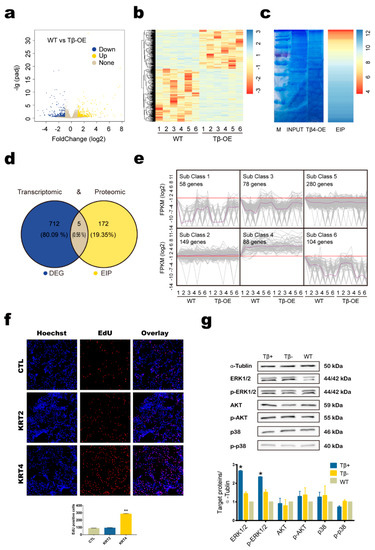 The integrated transcriptomic and proteomic strategy used to investigate the mechanisms underlying the increase in cashmere yield and hair follicle development associated with of Tβ4. (a) The volcano plot of all genes in the skin samples from the Tβ4 overexpression (Tβ4-OE) cashmere goats and WT cashmere goats, showing genes with a >2-fold difference and an adjusted p < 0.01 among the groups. (b) The heat map of the gene expression profiles in the skin samples from the Tβ4-OE and wild type (WT) cashmere goats. The colored bars illustrate relative expression. In the map, each sample group is clustered. (c) HeLa cells transiently overexpressing Tβ4 were immunoprecipitated with the anti-Tβ4 antibody for Coomassie Brilliant Blue staining; possible proteins that interact with Tβ4 were identified using mass spectrometry. (d) Venn diagram illustrating the overlap of five genes between the transcriptome-identified DEGs and the proteome-identified enriched interacting proteins (EIP). (e) A cluster analysis of DEGs identified among the skin samples of the Tβ4-OE and WT goats and functional categorization of the recovered subclusters. (f) Results of the EdU staining assay, showing cell proliferation in secondary hair follicle dermal papilla cells (SHF-DPCs) overexpressing keratin type II cytoskeletal 2 epidermal (KRT2) or keratin type II cytoskeletal 4 (KRT4). Hoechst reagent stains all cell nuclei, while the EdU (5-Ethynyl-2′-deoxyuridine) reagent only stains the newly proliferated cell nuclei (** p < 0.01). (g) Detection of the proliferation-related signaling pathways in Tβ4-OE cashmere goats with significantly improved cashmere yield (Tβ4+), Tβ4-OE cashmere goats with no significant increase in cashmere yield (Tβ4-), and wild type cashmere goats (WT) (* p < 0.05).