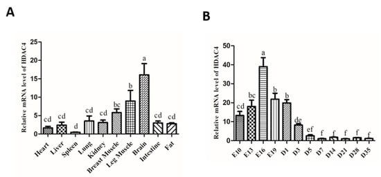 Expression pattern of HDAC4 gene in chickens. (A) The HDAC4 mRNA expression level was measured by qPCR in different tissues and organs of chicken. (B) The expression level of HDAC4 in breast muscle during E10 to D35 was detected by qPCR. In all panels, the values represent mean ± SEM from three independent experiments. a,b p < 0.05.