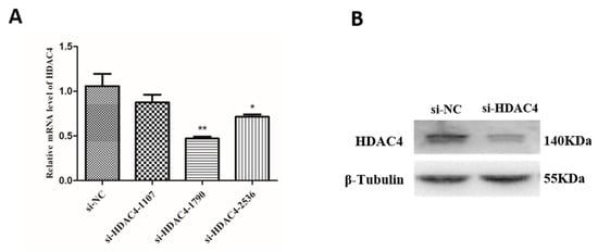 Confirmation of interference efficiency of the HDAC4 gene. (A) The relative mRNA level of HDAC4 in skeletal muscle satellite cells (SMSCs) after being transfected with three siRNA (si-HDAC4-1107, si-HDAC4-1709, and si-HDAC4-2536) and si-NC. (B) The protein expression level of HDAC4 after interference by si-HDAC4 was detected by western blotting. In all panels, the values represent mean ± SEM from three independent experiments. * p < 0.05; ** p < 0.01.