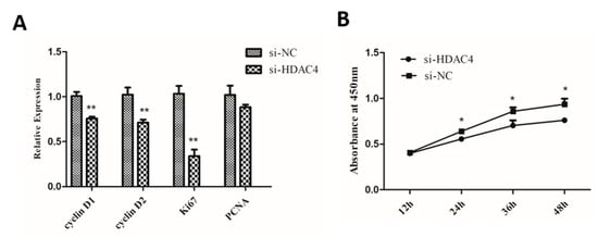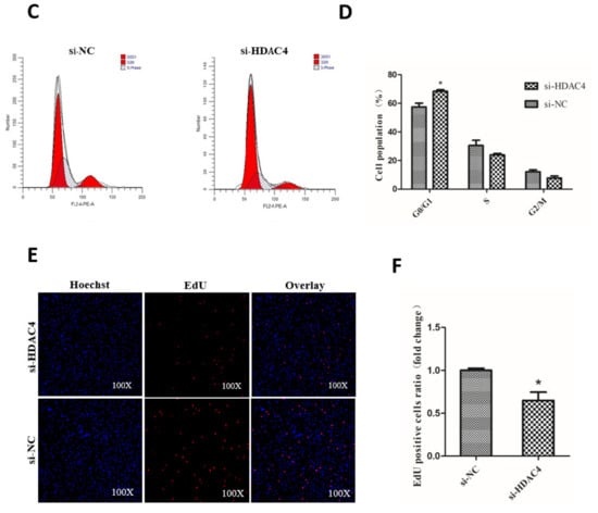 Knockdown of HDAC4 inhibits the proliferation of chicken SMSCs. (A) The expression level of cyclinD1, cyclinD2, Ki67, and PCNA was determined by qPCR in SMSCs after being transfected with si-HDAC4 and si-NC. (B) The proliferation activity of SMSCs after transfection with si-HDAC4 and si-NC was evaluated by CCK-8 at 12 h, 24 h, 36 h, and 48 h. (C,D) Flow cytometry for cell cycle analysis of SMSCs at 48 h after transfection of si-HDAC4 and si-NC. (E) EdU assays for SMSCs transfected with si-HDAC4 and si-NC for 36 h. EdU (red) fluorescence indicates proliferation. Hoechst (blue) fluorescence indicates nuclei. All photomicrographs are at 100× magnification. (F) The percentage of EdU stained cells to total cells was calculated at 36 h after transfection of si-HDAC4 and si-NC. In all panels, the values represent mean ± SEM from three independent experiments. * p < 0.05; ** p < 0.01.