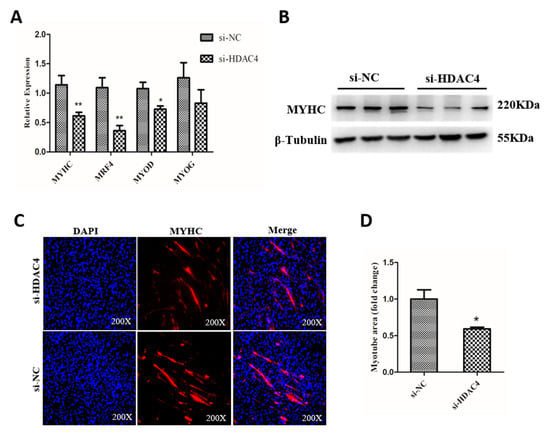 Knockdown of HDAC4 inhibits the differentiation of chicken SMSCs. (A) The mRNA level of MYHC, MRF4, MYOD1, and MYOG was determined by qPCR in SMSCs after being transfected with si-HDAC4 and si-NC. (B) The protein expression level of MYHC was determined by western blotting in SMSCs after being transfected with si-HDAC4 and si-NC. (C) SMSCs transfected with si-HDAC4 and si-NC induced to differentiate for 72 h were stained with MYHC antibody and DAPI (nuclei). All photomicrographs are at 200× magnification. (D) The percentage of myotube area to total cell area was calculated at 72 h after transfection of si-HDAC4 and si-NC. In all panels, the values represent mean ± SEM from three independent experiments. * p < 0.05; ** p < 0.01.