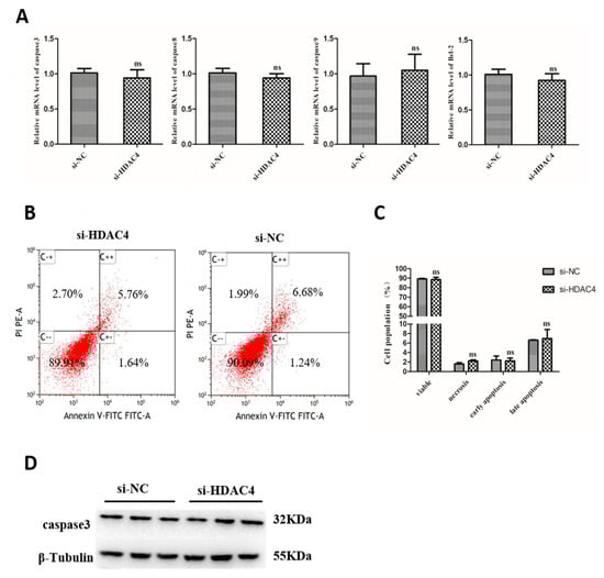 Knockdown of HDAC4 has no effect on the apoptosis of chicken SMSCs. (A) The mRNA level of caspase 3, caspase 8, caspase 9, and Bcl-2 was determined by qPCR in SMSCs after being transfected with si-HDAC4 and si-NC. (B,C) Flow cytometry for cell apoptosis analysis of SMSCs at 48 h after transfection with si-HDAC4 and si-NC. (D) The protein expression level of caspase 3 was determined by western blotting in SMSCs after being transfected with si-HDAC4 and si-NC. In all panels, the values represent mean ± SEM from three independent experiments. * p < 0.05; ** p < 0.01.
