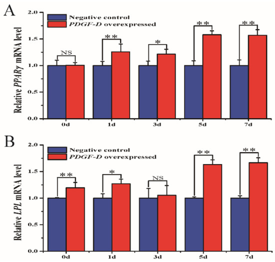 3.6. Influence of Overexpressed PDGF-D on the Expression of Adipose Differentiation-Related Marker Genes