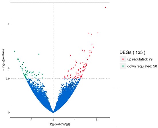 Volcano plot of differentially expressed genes in the hypothalamus. DEGs were filtered using a p-value < 0.005 as a threshold. Red spots represent up-regulated genes, and green spots indicate down-regulated genes. Blue spots represent genes that did not show obvious changes between the HEP and LEP samples.