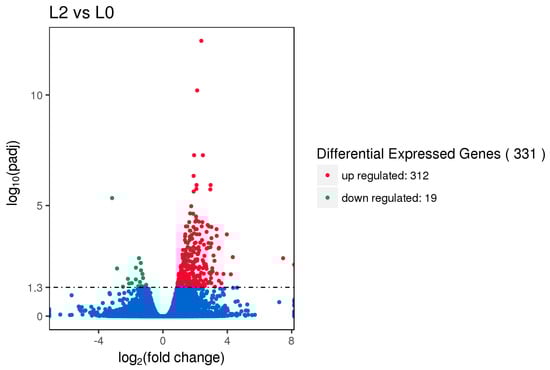 Volcano plot of differentially expressed genes in the ovary. DEGs were filtered using Padj < 0.05 as a threshold. Red spots represent up-regulated genes, and green spots indicate down-regulated genes. Blue spots represent genes that did not show obvious changes between the HEP and LEP samples.