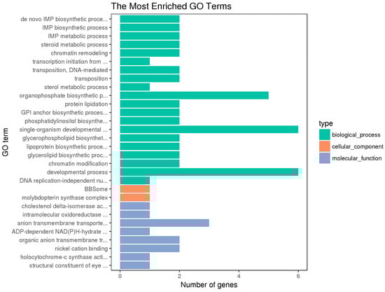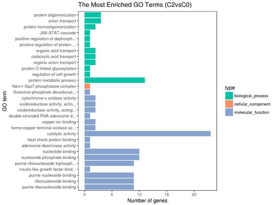Blast2 GO software was used to compare the differentially expressed genes and annotate GO functions. The GO annotation includes the enrichment of molecular functions, biological processes, and cellular components [] (Figure 4, Figure 5 and Figure 6).